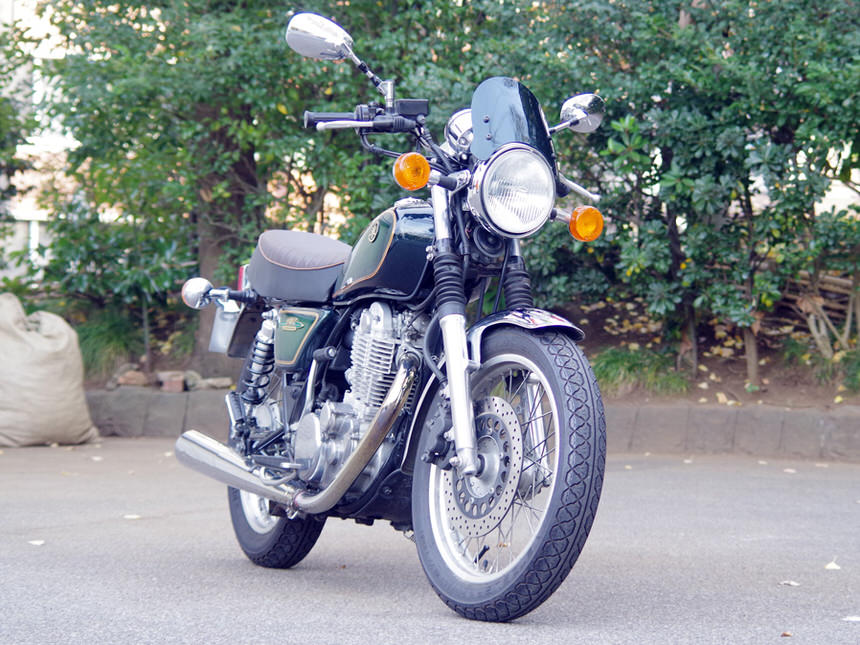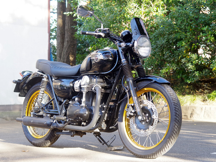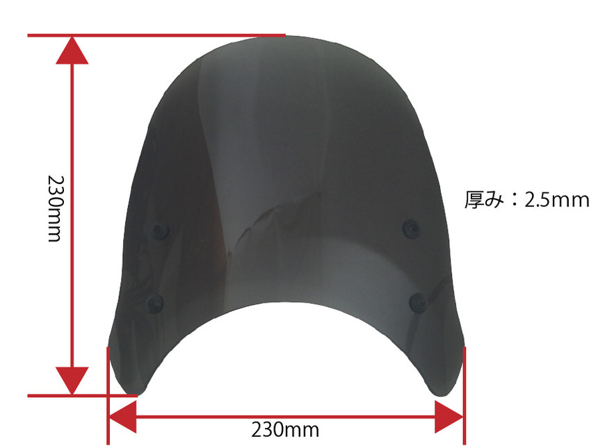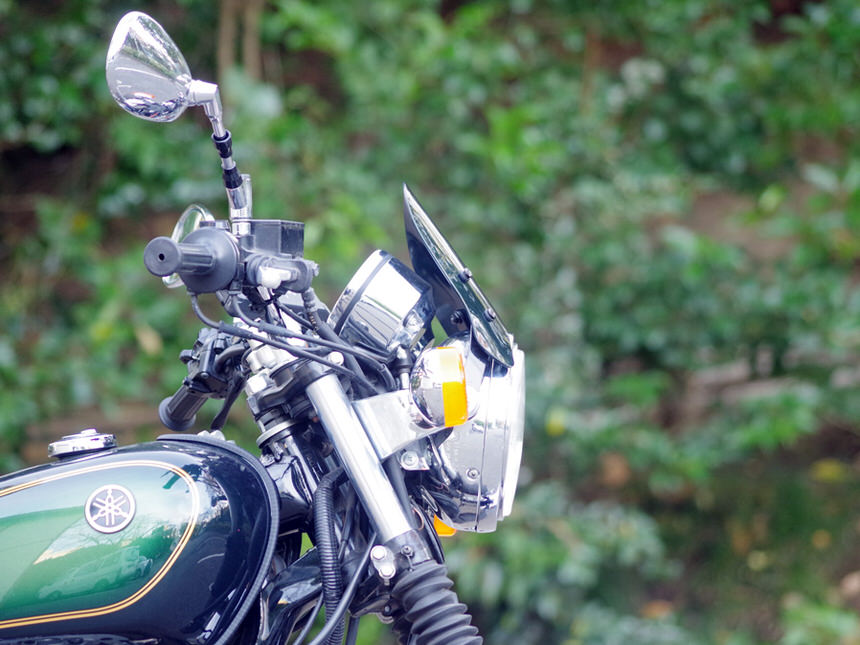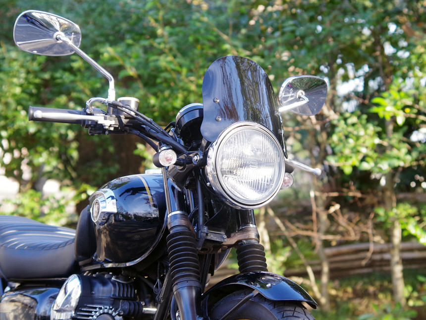 W1【ダブルワン】を始祖とするW800や30年以上変わらないデザインを貫き通すヤマハ・SR400。シンプルなスチールフレームに空冷エンジン、フェンダーなどにはクロームメッキが施され、ホイールはスポークホイール。現行にラインナップされながらもクラシカルな雰囲気を持っているバイクをネオクラシックと表現するメディアやユーザーは多く存在します。スーパースポーツバイクやネイキッドバイクに根強いファンが存在するようにネオクラシックスタイルのバイクにも多くのファンが存在します。弊社スタッフの清水もその一人。ネオクラシックメーターバイザーは一人のネオクラシックバイクファンである清水が「もっとクラシックバイクに似合うメーターバイザーを作りたい!」という思いで製作したものです。ヘッドライトは様々な大きさがあり大きいヘッドライトにも対応するデザインにした方が沢山の車両に装着できるのですが、性能面と共に大事なポイントになったのがクラシックバイクに装着した際のフォルムです。「バイザーもカウルの一部として見せたい」という思いから日本を代表する二台のクラシックバイク・SR400とW800の二台のバイクに装着することを前提にデザインを決定しました。ヘッドライトの上にピタリと装着できるのはもちろんですが、全体的に丸みを帯びたデザインを採用しSRやWのイメージを崩さない造形としました。清水の趣味はツーリング時にダムに立ち寄りダムカードを集めること。試作品のメーターバイザーを愛車のW800に装着して毎週末全国各地のダムに出かけていきました。「風防効果のない形だけのメーターバイザーにはしたくない」という思いから自分が使って「体感できる」形状を目指してトライ&エラーを繰り返しました。カスタムベースにも選ばれることが多いSRやWシリーズですが、ライディングポジションは上体が起きたポジションになります。そのため80km/h以上での高速走行では風との戦いになります。橋の上などで強い風が吹けば体が後ろに引っ張られるような経験をした方もいるはずです。とても小さいウインドスクリーンですので体全体に当たる風をやわらげることは出来ませんが、体の中心部分に当たる風をやわらげる効果があり高速走行時の風当たりを軽減しアクセルを開けるのが楽になります。下道を走る速度域では体感的に違いを感じることはあまりありませんが、体に当たる風を確実に緩和させているため目的地に到着した際に疲労の軽減を感じることが出来るはずです。W800とSR400に合わせて設計しましたが、180φ前後のヘッドライトを採用しており、ヘッドライトの固定方法が左右二点止めの車輌には装着可能です。ただし汎用製品の為に装着する車輌によっては多少の加工が必要になる可能性はございます。SR400、W400、W650、W800は開発の際に合わせておりますので、ボルトオンで装着可能です。※ヘッドライトが多少小さめの車輌であっても、先にステーを装着し、広げることで装着可能です。