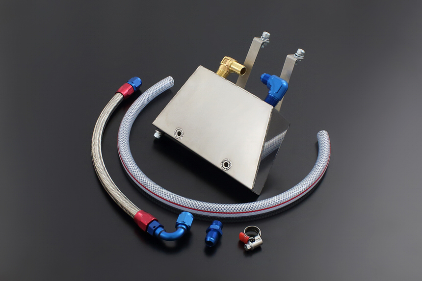エアクリーナーBOXを取り外した際の必需品。エンジンから排出されるブローバイガスを浄化します。EARL'sステンメッシュ仕様とビニールホース仕様の2ラインナップフレームマウントステー付ツールBOXキットと併用する事をお勧めします。Note:ブローカバーホース穴にM14-Pc1.50のタップ加工が必要です。