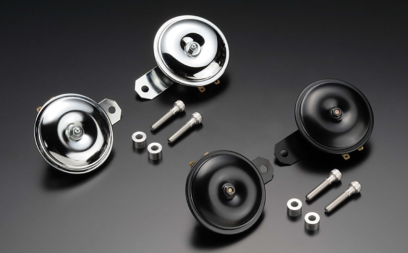 エキゾーストや、ラジエター ステーを交換した際に意外と移動場所に困るホーンをラジエターアッパーマウント部分、またはアッパーカウル内側のヘッドライトサイド部分のいずれかに取り付け可能なコンプリートセット。