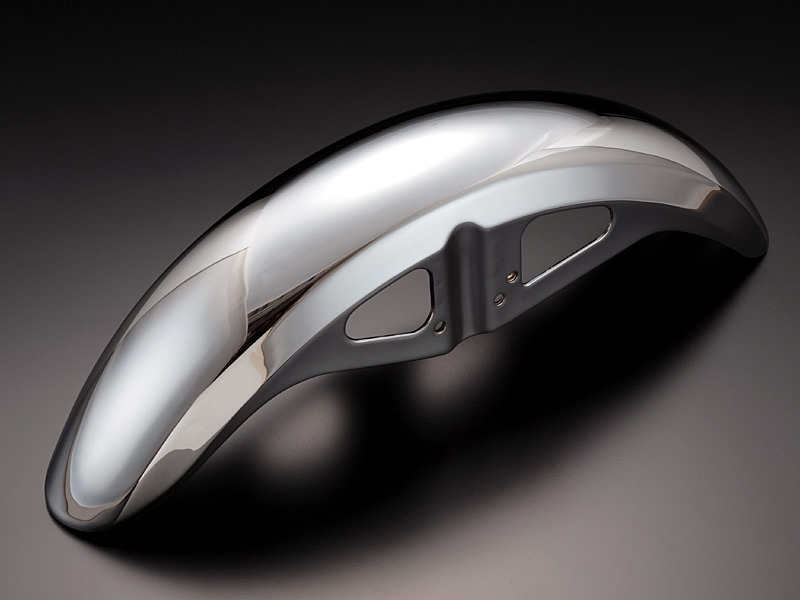 Mk-IIのスタイリングフォルムをキメつける「やや角張ったサイドダクト付き」のフロントフェンダーは、角Zのイメージ作りには欠かせないアイテムです。750FX-1、Mk-2以外に4穴ディスクローターの76~80年のZ750-1000にも装着可能です。高級感あふれるクロームメッキ仕上げ。
