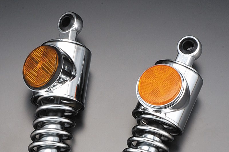 ※メーカー欠品中には入荷までに週週間以上のお時間を要する場合がございます。オリジナル復刻版。プログレッシブ (不等ピッチ )スプリングの採用により、初期作動から1G付近まではやわらかく、1Gからボトムまでは曲線的に硬くなるという、粘り強さを持ったスペシャルサスペンション。バネレートは純正サスペンションと同様の設定とした純正型と、バネレートを15%上げた強化型の2ラインナップ。リフレクターはオレンジ、レッド、クリアの3色に、それぞれブラックリム、メッキリムを用意しました。豊富なバリエーションの中からお好みでお選び下さい。2本セット1台分でのデリバリー。