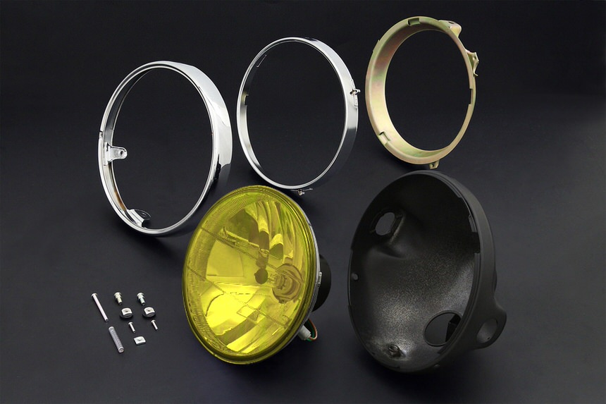 ※メーカー欠品中には入荷までに週週間以上のお時間を要する場合がございます。リフレクター形状の変更により配光性能が飛躍的に向上。前方をより明るく広範囲に照射します。● ヘッドランプ単体のデリバリーの他、高級感溢れるクロームメッキ仕上げのヘッドライトリム付キットとブラックペイントまたは、クロームメッキ仕上げのケースまで付属するシステムキットを用意いたしました。● レンズカラーは、クリアー、ブルー、イエロー、スモークブラックの4ラインナップ。● レンズには強化プラスティックを採用し、抜群の耐久性を実現。● レンズ径は、一般的な180mmです。● 付属のH4バルブは、オールマイティー仕様の12V (55/60W)を採用。● DOT規格をクリアーした車検対応品です。※ ポジションを点灯させる場合、配線の加工が必要となります。