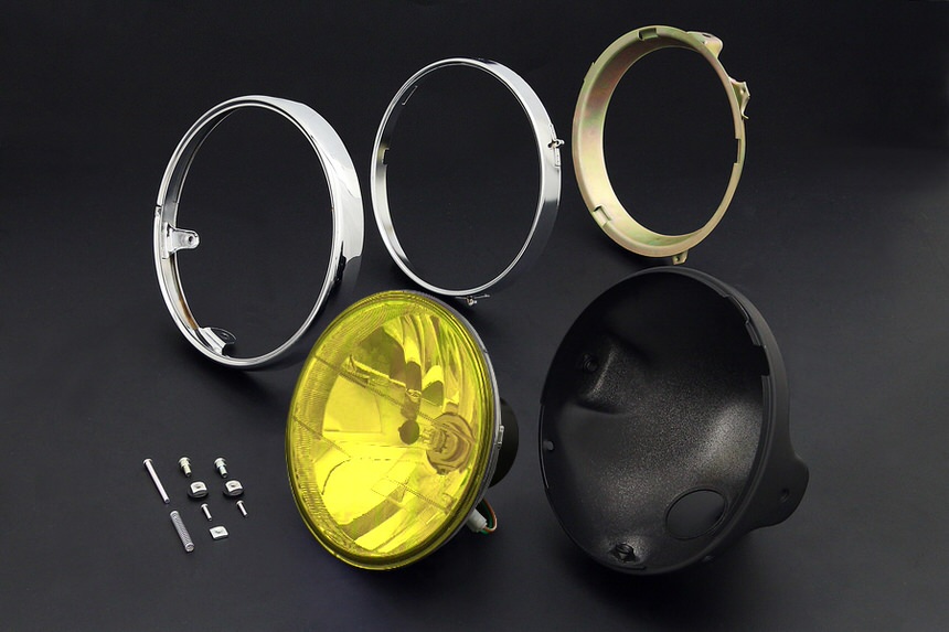 ※メーカー欠品中には入荷までに週週間以上のお時間を要する場合がございます。リフレクター形状の変更により配光性能が飛躍的に向上。前方をより明るく広範囲に照射します。● ヘッドランプ単体のデリバリーの他、高級感溢れるクロームメッキ仕上げのヘッドライトリム付キットとブラックペイントまたは、クロームメッキ仕上げのケースまで付属するシステムキットを用意いたしました。● レンズカラーは、クリアー、ブルー、イエロー、スモークブラックの4ラインナップ。● レンズには強化プラスティックを採用し、抜群の耐久性を実現。● レンズ径は、一般的な180mmです。● 付属のH4バルブは、オールマイティー仕様の12V (55/60W)を採用。● DOT規格をクリアーした車検対応品です。※ ポジションを点灯させる場合、配線の加工が必要となります。