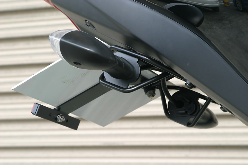 ※LEDナンバー灯取り付けに当たっては配線加工が必要です。ナンバープレート共振時には防振ゴム貼付等対応ください。スポーティーでレーシーなYZF-R25とR3(MT-25/03)。そのリアフェンダーを取り外し、ナンバープレートとウインカーを移設するキットです。ナンバーステーは、金属板の曲げ物が一般的ですが、カラーとシャフトを使用したトラス構造とすることによって、非常にレーシーなスタイルとなりました。キットには、LEDナンバー灯とスリムリフレクターも付属しており、より一層シンプルなリアビューとなっています。完璧なレーシースタイルの実現です。後方に伸びた純正リアフェンダー。これを丸ごと取り外し、ナンバープレートとウインカーを極力ボディ側へと移設させるフェンダーレスキット。従来は金属の曲げ板での製作が多かったのですが、カラーとシャフトを使用してワンオフ的なスタイルのトラス構造としました。非常にシンプルでレーシーな構造です。シンプルでスポーティなリアビューを総合的に実現しています。ナンバープレートの位置を変更しても、純正のナンバー灯と、純正のリフレクターでは、スタイルが台無しです。キットには、LEDナンバー灯とスリムリフレクターを付属させました。このナンバー灯とリフレクターを使用することにより、トラス構造のステーと相まって、より一層のシンプル&レーシースタイルを完全な形としています。