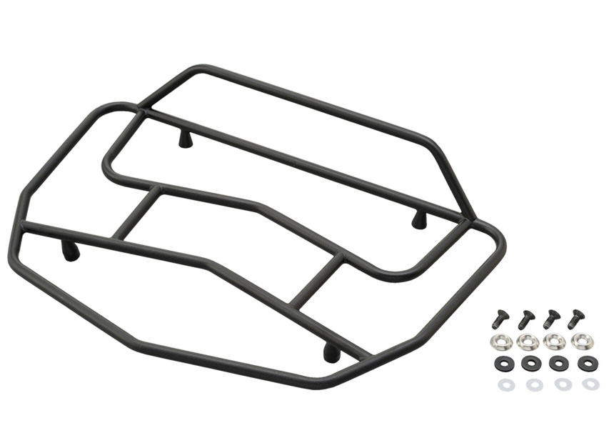 旧品E96よりも軽量でラック面がワイドな新型メタルラック。ケース上面も有効利用。E55(N/NTのみ)、E52専用。サイズ=縦290×横415×高さ80mm(最大部)。重量850g。※取り付けにはケース本体への穴開け加工が必要。※加工穴ピッチが異なるため旧品E96(41141)からの付け替えはできません。※E52はシリーズ全品対応ですが、E55は未塗装ブラック/TECH専用。E55塗装カバー仕様にも物理的な取り付けはできますが、トップシェルと塗装パネル間の防水性能が確保できなくなるため適合外とします。※キャリアの最大積載重量を超えない範囲での使用に限ります。
