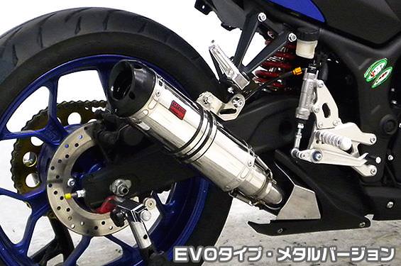 ※サイレンサー部分だけ取り替えるスリップオンタイプの商品です。フルエキゾーストタイプのマフラーではありませんのでご注意ください。※平成22年4月1日より施行された認証制度に適合する認証マフラーではありません。ご理解の程よろしくお願い致します。※受注生産商品となっており、商品手配後 2週間程度入荷にお時間を頂きます。メタルバージョンはステンレスをバフ磨きでピカピカに仕上げています。アルミ素材から削り出したビレットタイプのエンドに、ブラックアルマイト処理を施したEVOタイプ消音用のバッフルが2個装備されている【ダブルバッフル仕様】となっており、バッフル無し、バッフル1個装着、バッフル2個装着と3種類の排気音を選べるサウンドセレクトスタイルになっています。バッフルはステンレスタイプ(EVOタイプはプレートタイプ)とアルミタイプの2種類のバッフルが装備されています。音量はバッフル2個装着時の排気音量が約86db(約87db)(法定規制値内音量)、バッフル1個装着時の排気音量が約88db(約89db)、バッフル非装着時の排気音量が 約90db(約92db) です。※( )内の音量はYZF-R3です。音質も耳障りな音でなく重低音のサウンドになっていますので、ノーマルマフラーではちょっと物足りない方にオススメです。サイレンサーはストレート構造ではなく隔壁構造になっていますので、音量は静かめに抑えられており近所迷惑になる事無く安心して走行できます。低中速を落とすことなく高回転でスムーズに回り扱いやすい設定になっています。振動防止のためサイレンサーとエキパイが2分割となる安心設計になっています。サイレンサーは、2点止めになっていますのでしっかりと固定でき、耐久性にも優れています。無加工ボルトオンにて装着できますので、必要な工具があれば簡単に取り付けできます。(取り付けに必要なボルト類は全て付属しております。)テールパイプとエキパイとの接続部分を隠し、空力性能を向上させる ヒートガード を 標準装備 しております。ポリッシュ仕上げ と ブラック仕上げ の 2タイプ をご用意しておりますので、お好みでお選び下さい。本商品はビートガード:ブラック仕様となります。※ヒートガードはノーマルカウル装着車のみ適合します。サイレンサーバンドにはスリットタイプを採用してデザインにもこだわっています。サイレンサーの固定にはサイレンサーバンドを採用し、バフ仕上げを施したステンレス製丸棒で組んだステーを介して固定しておりますので、従来のステーの固定より車体と調和した高級感あふれるマフラーです。オールステンレス製で、エキパイからサイレンサーまでバフ仕上げを施しています。