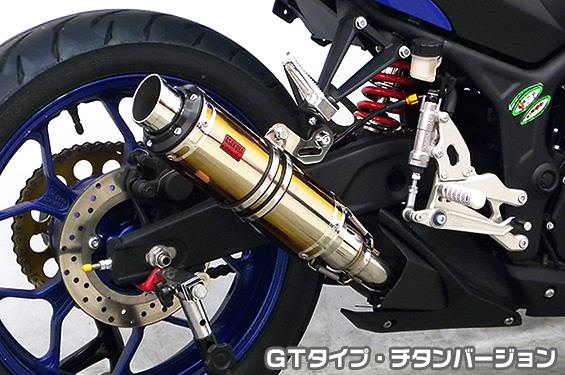 ※サイレンサー部分だけ取り替えるスリップオンタイプの商品です。フルエキゾーストタイプのマフラーではありませんのでご注意ください。※平成22年4月1日より施行された認証制度に適合する認証マフラーではありません。ご理解の程よろしくお願い致します。※受注生産商品となっており、商品手配後 2週間程度入荷にお時間を頂きます。※装着画像のヒートガードの画像はブラック仕上げとなっておりますが実際のお届け商品はポリッシュ仕上げとなります。ご注意くださいませ。チタンバージョンは軽量高剛性なチタニウム製パイプにレインボーの焼き色を付けた、非常に高級感の高い仕上がりです。ブラックアルマイト処理を施したビレットタイプのテールマウントに、シンプルかつレーシーなイメージのGTタイプです。消音用のバッフルが2個装備されている【ダブルバッフル仕様】となっており、バッフル無し、バッフル1個装着、バッフル2個装着と3種類の排気音を選べるサウンドセレクトスタイルになっています。バッフルはステンレスタイプとアルミタイプの2種類のバッフルが装備されています。音量はバッフル2個装着時の排気音量が 約86db(約87db)(法定規制値内音量)、バッフル1個装着時の排気音量が 約88db(約89db)、バッフル非装着時の排気音量が 約90db(約92db) です。※( )内の音量はYZF-R3です。音質も耳障りな音でなく重低音のサウンドになっていますので、ノーマルマフラーではちょっと物足りない方にオススメです。サイレンサーはストレート構造ではなく隔壁構造になっていますので、音量は静かめに抑えられており近所迷惑になる事無く安心して走行できます。低中速を落とすことなく高回転でスムーズに回り扱いやすい設定になっています。振動防止のためサイレンサーとエキパイが2分割となる安心設計になっています。サイレンサーは、2点止めになっていますのでしっかりと固定でき、耐久性にも優れています。無加工ボルトオンにて装着できますので、必要な工具があれば簡単に取り付けできます。(取り付けに必要なボルト類は全て付属しております。)テールパイプとエキパイとの接続部分を隠し、空力性能を向上させる ヒートガード を 標準装備 しております。ポリッシュ仕上げ と ブラック仕上げ の 2タイプ をご用意しておりますので、お好みでお選び下さい。本商品はビートガード:ポリッシュ仕様となります。(画像はブラック仕様ですがこちらの商品の仕様ははポリッシュとなります。)※ヒートガードはノーマルカウル装着車のみ適合します。サイレンサーバンドにはスリットタイプを採用してデザインにもこだわっています。サイレンサーの固定にはサイレンサーバンドを採用し、バフ仕上げを施したステンレス製丸棒で組んだステーを介して固定しておりますので、従来のステーの固定より車体と調和した高級感あふれるマフラーです。オールステンレス製で、エキパイからサイレンサーまでバフ仕上げを施しています。