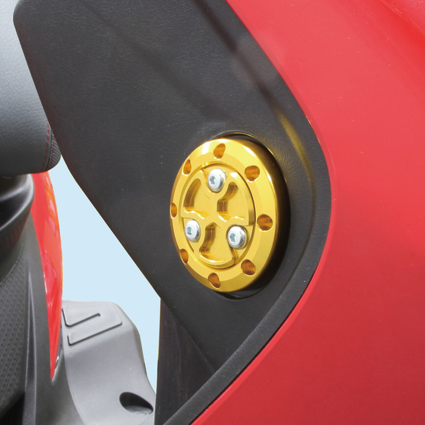 サイドリフレクター取付部に装着するワンポイントのドレスアップパーツです。アルミ製2ヶ1SET