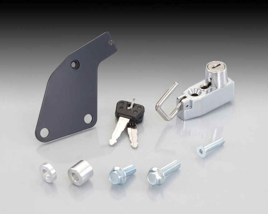 タンデムステップにヘルメットホルダーを追加。ヘルメットを掛けることができ便利です。プレート:スチール製ブラックキー:2ヶ付属左側タンデムステップと共締め取り付けボルト/カラー類付属
