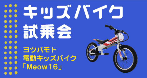 • 雨天や強風の場合は中止、中止の判断は1営業日ごとに実施いたします。• キッズバイク公式twitter(@bikeo_kids_bike)↓↓ページ下部↓↓にて、試乗会の開催および中止や進行状況のお知らせを掲載いたします。※開催予定日の前日正午には毎回、開催日当日は適宜、お知らせを掲載いたします。