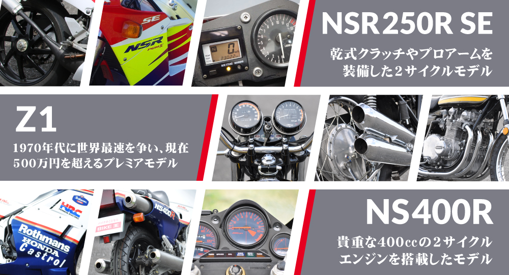 ①NSR250R-5SE②NS400R③Z1④GSX1100Sカタナ※車種は予告なく変更になる場合がございます。